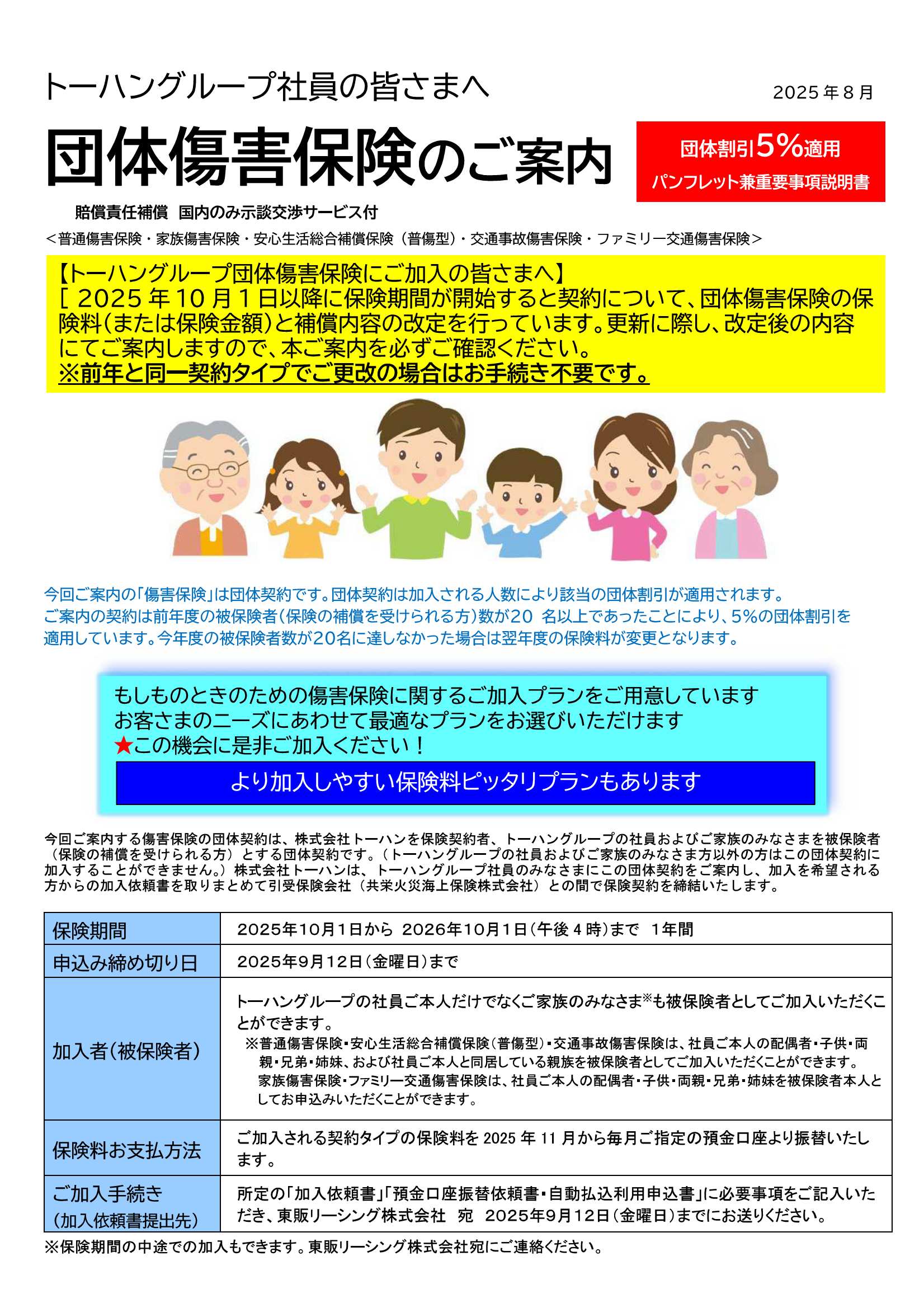 一般の個別契約に加入するのに比べて保険料が5%割引となっているお得な保険です。