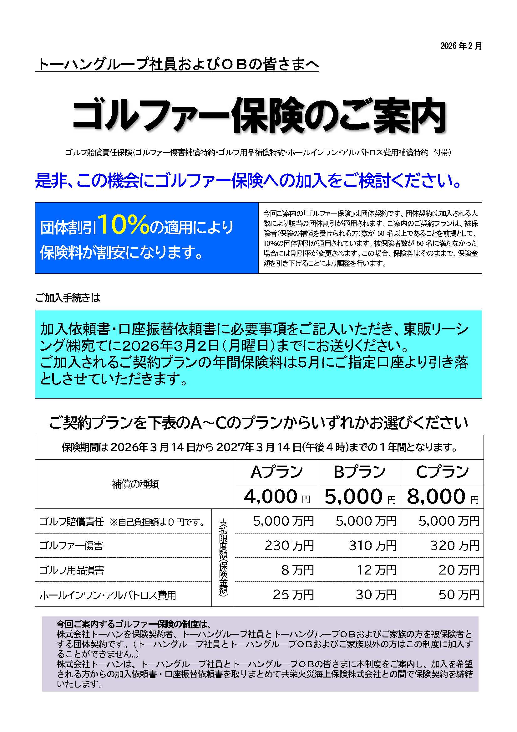 トーハングループの皆様に、 今年もゴルファー保険の一斉募集をご案内いたします。